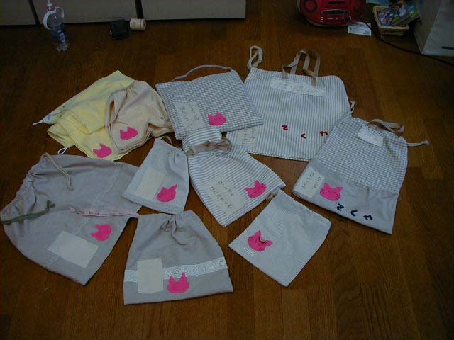 | 袋いろいろ。上のまんなかの真四角っぽいのは、「おざぶとん」です。キルト芯を適当なサイズにしたものに、カバー(綿テープでとめる)をかぶせています。 | |